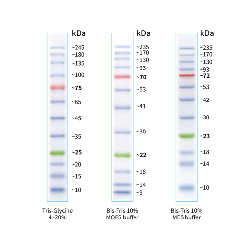本產(chǎn)品由跨度從 10-245 kDa 的 12 種高度純化預染的重組蛋白質組成,各條帶濃度約為 0.1-0.4 mg/ml。其中 25 kDa 條帶為綠色預染條帶,75 kDa 條帶為紅色預染條帶,方便判斷各個條帶的準確位置。本產(chǎn)品適合作為 SDS-PAGE 電泳時,變性蛋白樣品的分子量參照,并可實時觀察蛋白樣品的電泳分離狀況,也可用于檢測 Western blot 的轉膜效率。由于共價結合的染料會影響蛋白質分子的電泳遷移率,本產(chǎn)品僅適于粗略地估計目的蛋白樣品的分子量。