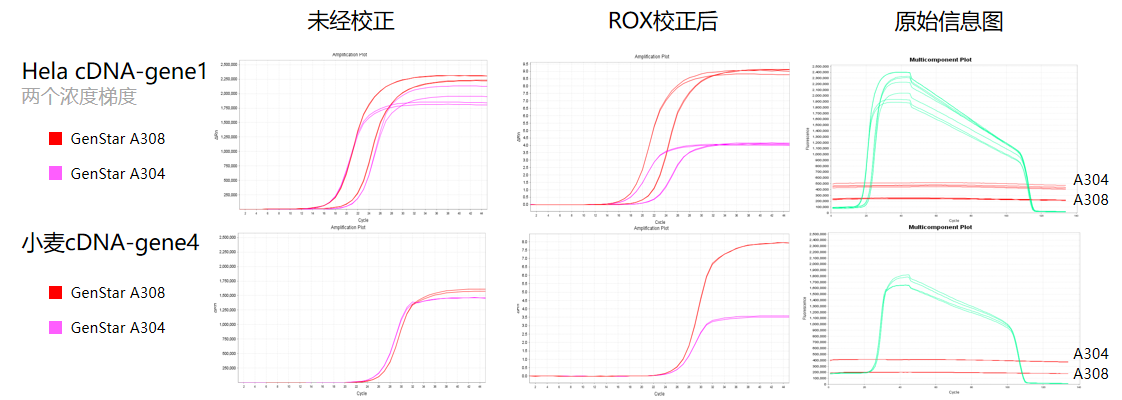 經(jīng)驗(yàn)證,A308 在 Low ROX 適用儀器上可進(jìn)行正常校正,且 ROX 校正后效果優(yōu)于 A304。