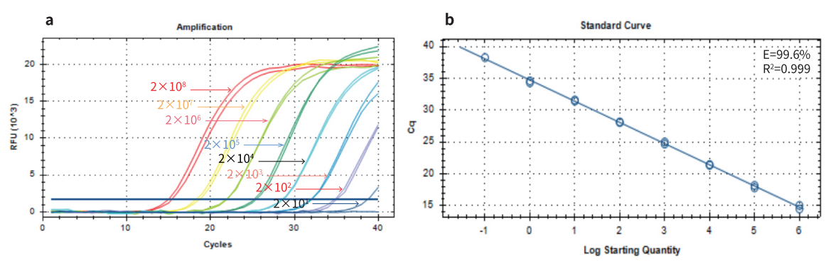 對濃度范圍為 2×101~2×108 copies/μl 的某 DNA 病毒陽性質粒,用GenStar #A392 進行 qPCR 檢測,結果顯示,GenStar #A392 可檢測出最低 DNA 量為 20 copies/μl。