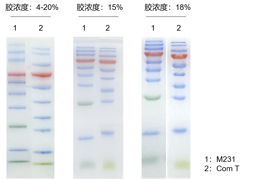 分別使用GenStar #M231、Com T 在不同濃度凝膠中進行電泳測試,上樣量 5 μl、電壓 200V、電泳 45 min。結果顯示,GenStar #M231 電泳條帶清晰,電泳遷移率和小條帶清晰度與 Com T 有差異,效果與 Com T 相當。