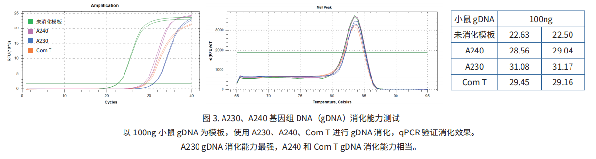 GenStar A230、A240 可有效去除 gDNA,保證擴(kuò)增結(jié)果的準(zhǔn)確性,避免 gDNA 殘留對(duì) qPCR 結(jié)果的干擾