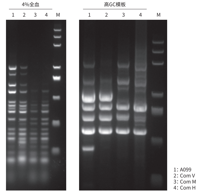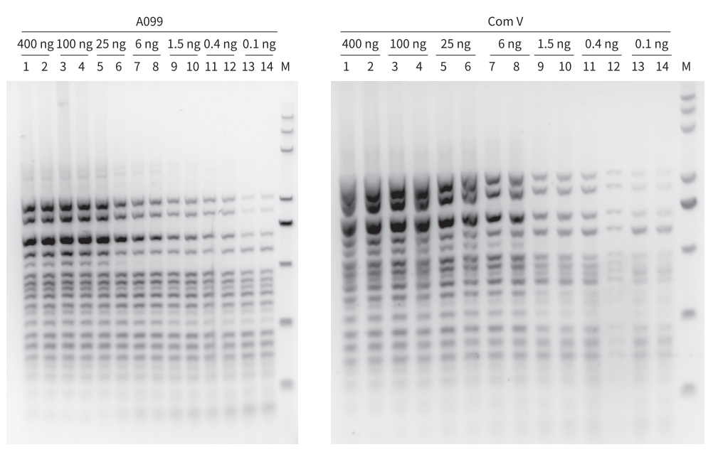 以 Human 基因組為模板,同時擴(kuò)增 19 個目的片段。結(jié)果顯示,A099 最低檢測限可達(dá) 0.1 ng,不會出現(xiàn)條帶丟失且條帶清晰優(yōu)于 Com V