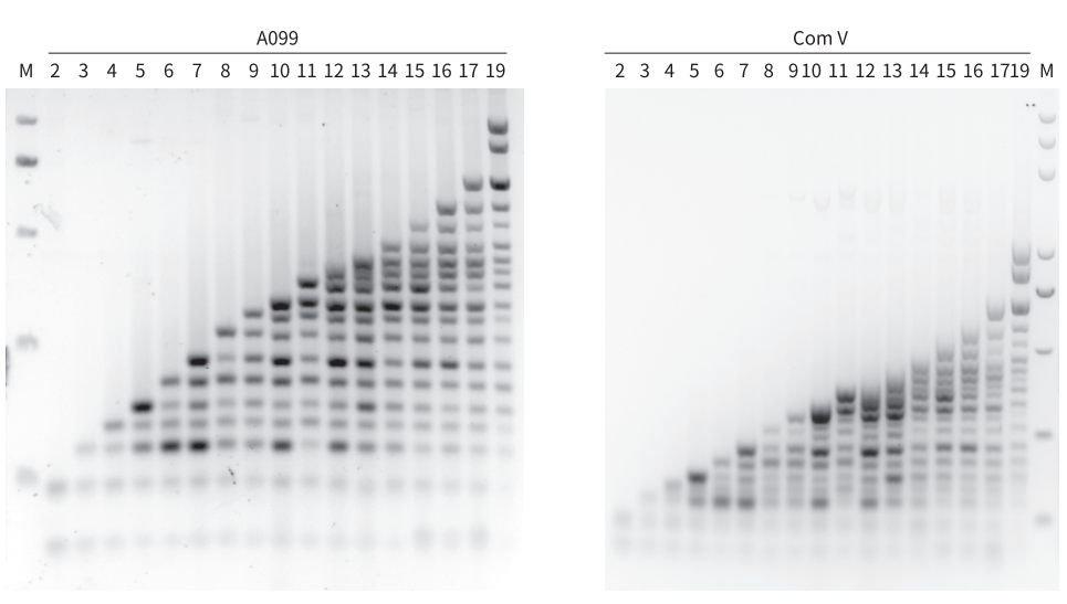 以 Human 基因組為模板,擴(kuò)增 2~19 重目的片段(50-1028 bp)。結(jié)果顯示,所有目的片段都清晰可見,A099 可在同一反應(yīng)中擴(kuò)增多達(dá) 19 個目的片段,且擴(kuò)增效率和條帶清晰度均優(yōu)于 Com V