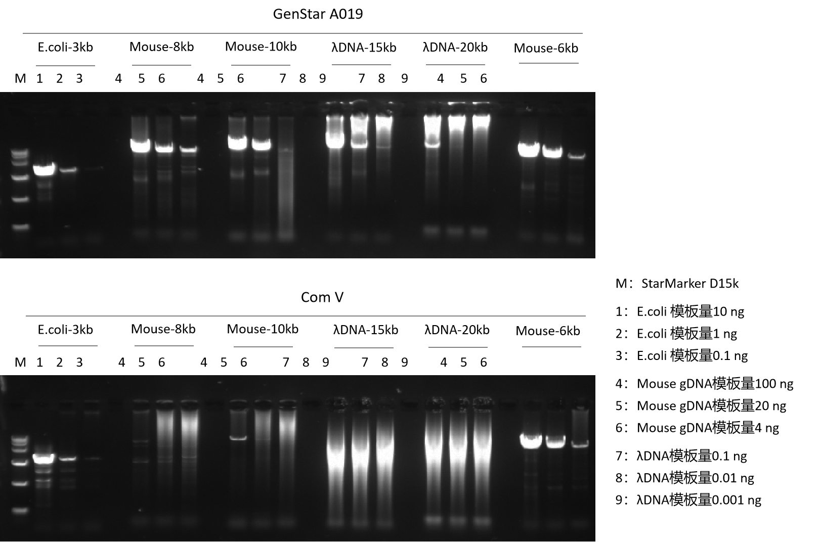 以 E.coli gDNA、Mouse gDNA、λDNA 為模板,使用 A019 和 Com V 進行不同長度片段的擴增。結果顯示,A019 對不同種屬來源的長片段擴增能力強,且優(yōu)于 Com V