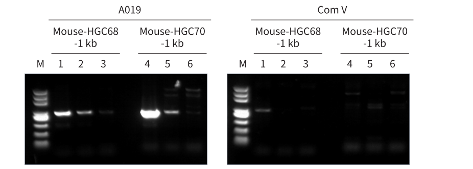 以 Mouse gDNA 為模板,使用 A019 和 Com V 進行高 GC 片段的擴增。結果顯示,A019 對高 GC 片段的擴增能力強,且優(yōu)于 Com V