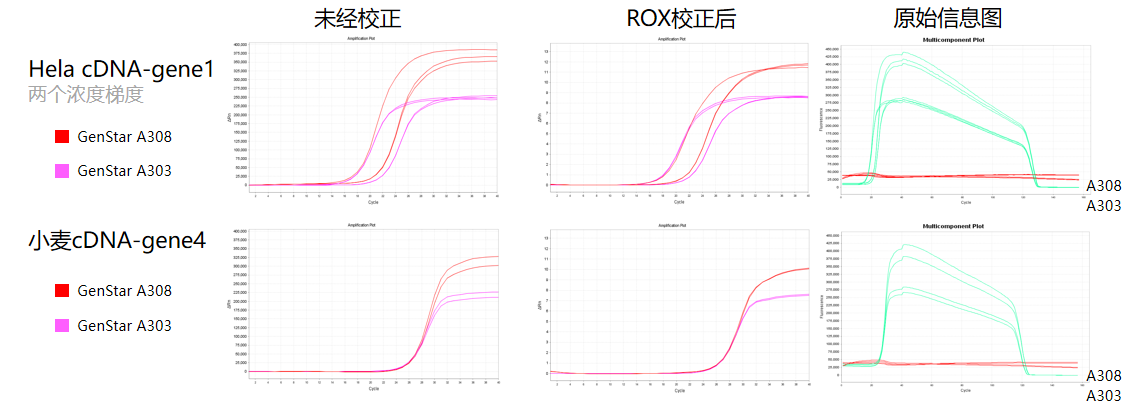 經(jīng)驗(yàn)證,A308 在 Low ROX 適用儀器上可進(jìn)行正常校正,且 ROX 校正后效果優(yōu)于 A304。