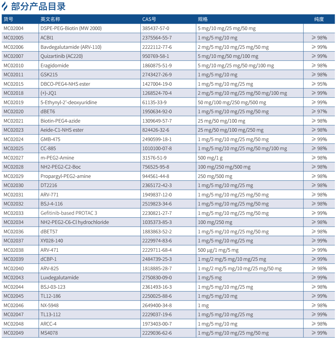 在患者體內(nèi),PROTAC 的靶蛋白配體和靶蛋白結(jié)合,E3 泛素連接酶配體和細(xì)胞內(nèi)的 E3 泛素連接酶的底物結(jié)合區(qū)結(jié)合,從而通過 Linker 把靶蛋白“拉近”到 E3 泛素連接酶旁邊,實現(xiàn) UPS 系統(tǒng)將靶蛋白降解。GenStar目前可提供多種 PROTAC 相關(guān)分子產(chǎn)品,包含:PROTACS、PROTACLinker、Ligands for E3 Ligase.Ligands for Target Protein for PROTAC、 Molecular Glues、ATTECs、E3 Ligase Ligand-LinkerConjugates 等。