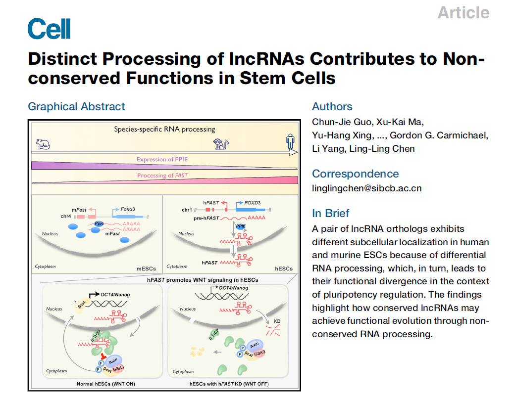 2020年4月6月,中國科學院分子細胞科學卓越創(chuàng)新中心(生物化學與細胞生物學研究所)陳玲玲研究組在國際知名雜志Cell在線發(fā)表了一篇題為’’Distinct processing of lncRNAs contributes to non-conserved functions in stem cells”的研究論文。